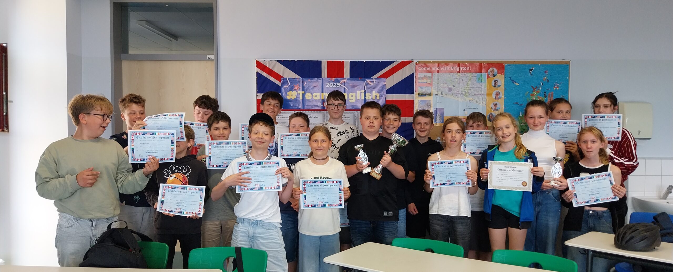 Besonders stolz sind wir auf unsere Jahrgangsbesten, die mit ihrem Wissen, ihrem Sprachgefühl und viel Engagement hervorragende Ergebnisse erzielt haben. In spannenden Quizfragen zu Grammatik, Wortschatz, Aussprache und Landeskunde konnten sie ihr Können unter Beweis stellen.