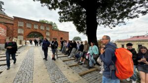 Am Dienstag stand Erkunden auf dem Plan. Wir waren morgens zu Besuch im Nationalmuseum, wo wir uns moderne Kunst und alte Kunstwerke und Alltagsgegenstände aus der polnischen Geschichte angeschaut haben. Danach gab es eine Stadtführung, die uns unter anderem zur alten geschichtsträchtigen Uni gebracht hat. Außerdem haben wir die Wawel Burg gesehen, die mit ihrer wechselnden Geschichte beeindruckte. Später sind wir noch durch Kazimierz gelaufen, ein Stadtteil mit viel Geschichte und einem breiten kulturellen Angebot. Das jüdische Viertel punktet besonders in Sachen Kulinarik. Dort haben wir Zapiekanka probiert – das ist sowas wie überbackenes Baguette mit Käse und Pilzen. Sehr lecker, nur zu empfehlen!